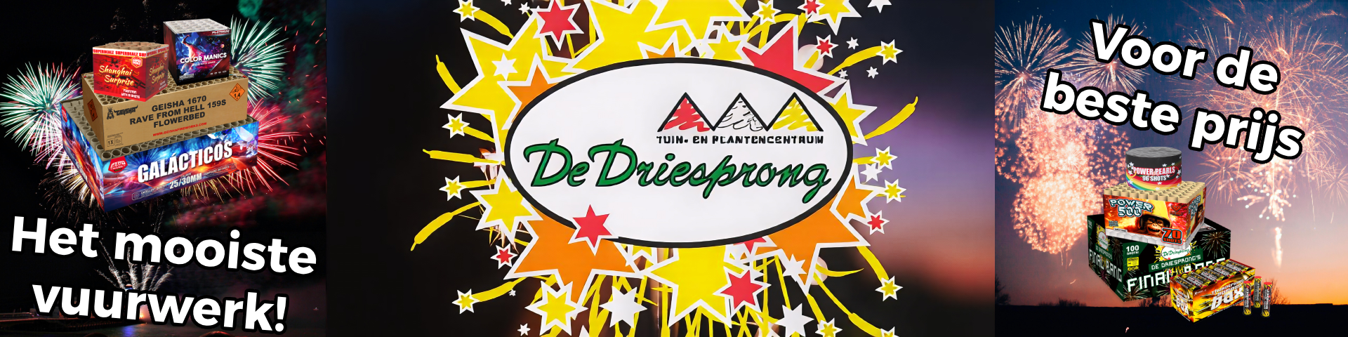 Welkom bij Vuurwerk de Driesprong, dé vuurwerkspecialist in Zoetermeer! Of u nu op zoek bent naar semi-professioneel vuurwerk voor een show in de straat, of naar klein vuurwerk om een feestje te vieren met je kinderen. Bij ons vind u het mooiste consumentenvuurwerk om het nieuwe jaar feestelijk in te luiden, wij bieden een uitgebreid assortiment aan topkwaliteit vuurwerk voor de beste prijzen!